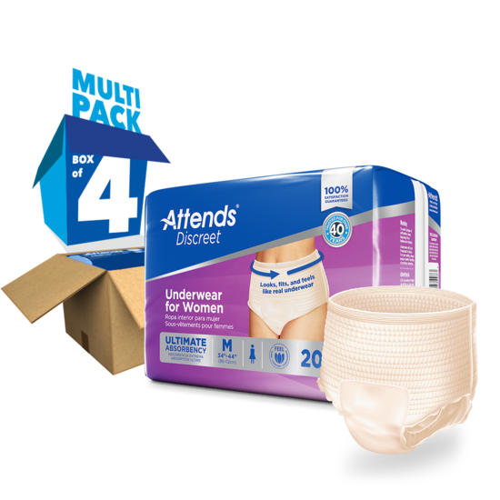 Attends Discreet Underwear is worn under clothing like regular underwear, they provide an alternative to briefs for more active individuals. This premium product is designed with a soft, cloth-like breathable fabric and full-belly elastic waistband for a comfortable, contoured fit. The advanced core materials have a high moisture capacity, channeling fluid and locking it away to keep the skin dry and healthy. With the added protection of barrier leg cuffs, Attends Discreet Underwear is recommended for moderate to heavy incontinence. Tear-away side panels make removal fast and easy.