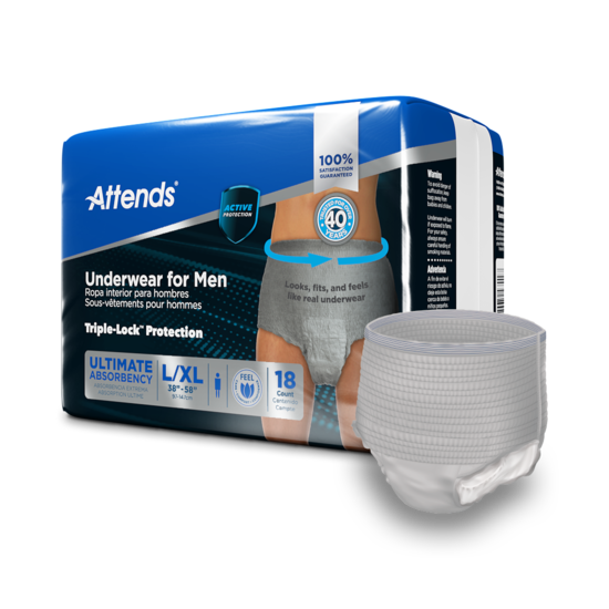 Attends Discreet Underwear is worn under clothing like regular underwear, they provide an alternative to briefs for more active individuals. This premium product is designed with a soft, cloth-like breathable fabric and full-belly elastic waistband for a comfortable, contoured fit. The advanced core materials have a high moisture capacity, channeling fluid and locking it away to keep the skin dry and healthy. With the added protection of barrier leg cuffs, Attends Discreet Underwear is recommended for moderate to heavy incontinence. Tear-away side panels make removal fast and easy.