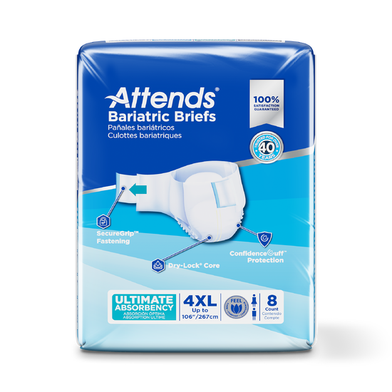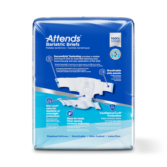 Attends Bariatric Briefs address the growing need for a brief designed specifically for larger individuals whose weight can cause excessive pressure on the bladder, resulting in heavy to severe incontinence. We designed our Bariatric Briefs with flexible, soft stretch panels and extra-wide secure tabs to provide a secure, individualized and comfortable fit for 70-100” waists. Constructed with breathable stretchable side panels, the brief provides breathability to allow sweat and moisture to evaporate, further promoting skin health and wellness. ConfidenceCuff™ Protection provides leakage protection around the legs for support and comfort, while the Super Absorbent Core helps pull liquid away from the surface to help keep you dry.