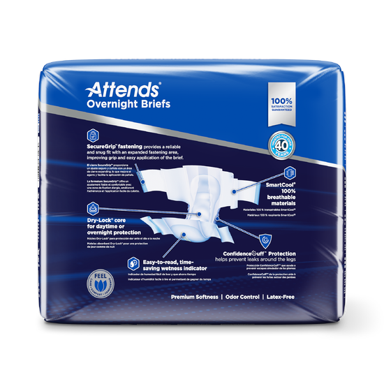 Attends Overnight Briefs are developed for users and caregivers looking for a product that can be used for extended periods of time. Our SecureGrip ™ fastening provides a reliable and snug fit with an expanded fastening area, improving grip and easy application of the Briefs. The Dry-Lock® core helps promote dryness for daytime or overnight protection, while ConfidenceCuff™ Protection helps prevent leaks around the legs. This brief features SmartCool™ Breathable Materials that provide 100% breathability to help improve comfort and help promote skin wellness. The brief is constructed with cloth-like material for premium softness and comfort and offers odor control.