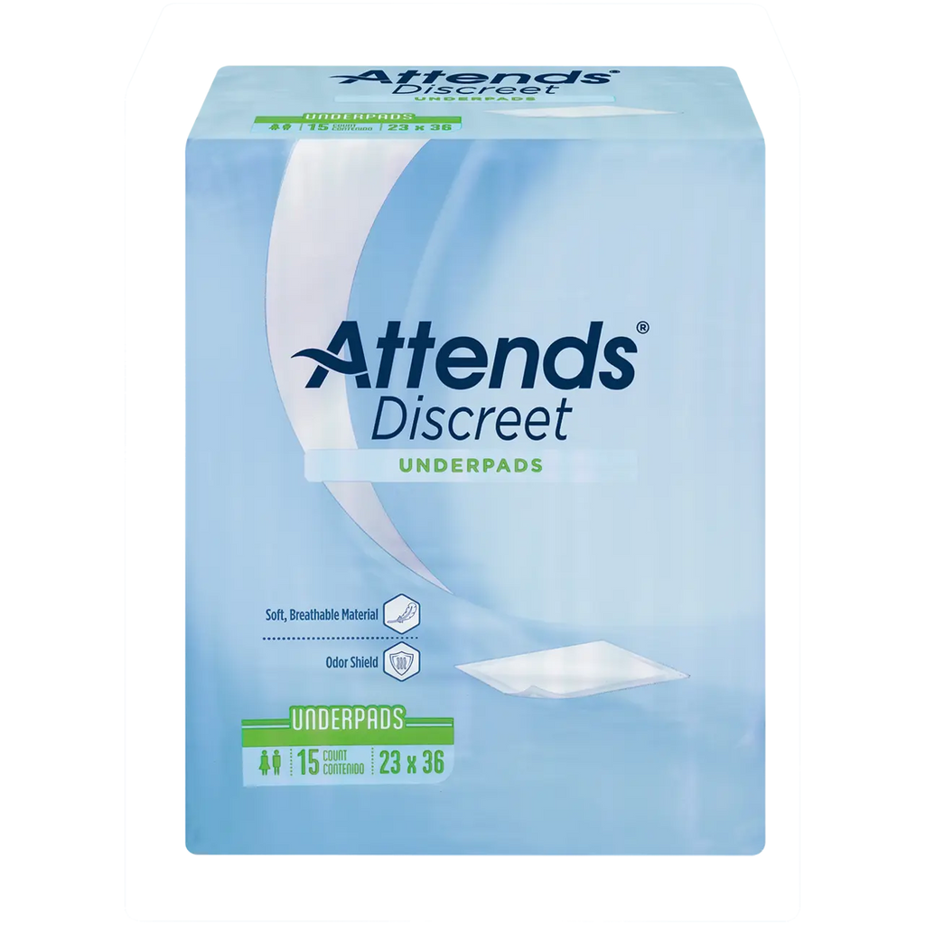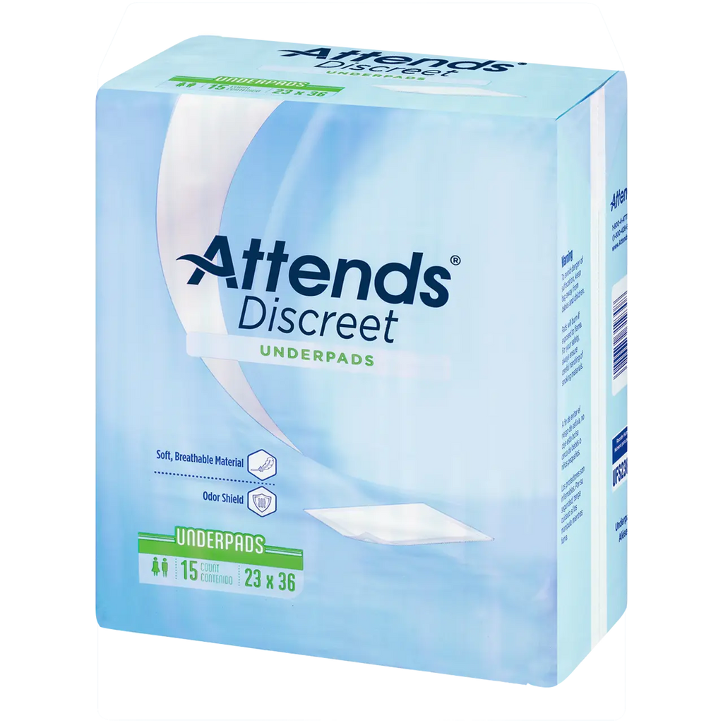Attends Discreet Underpads provide a protective layer that keeps linens and surfaces dry. Attends Discreet Underpads feature a waterproof moisture barrier that keeps beds and other flat surfaces dry and an absorbent padded core that locks away liquid to protect from leaks. Use to protect Beds, Chairs, linens from urinary incontinence.