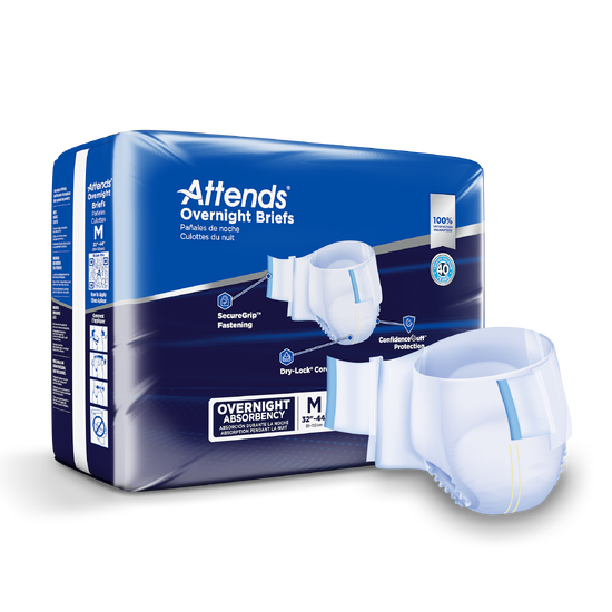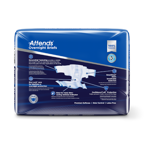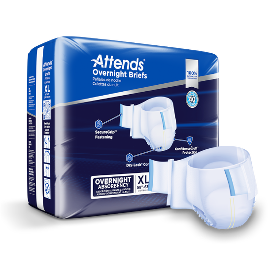 Attends Overnight Briefs are developed for users and caregivers looking for a product that can be used for extended periods of time. Our SecureGrip ™ fastening provides a reliable and snug fit with an expanded fastening area, improving grip and easy application of the Briefs. The Dry-Lock® core helps promote dryness for daytime or overnight protection, while ConfidenceCuff™ Protection helps prevent leaks around the legs. This brief features SmartCool™ Breathable Materials that provide 100% breathability to help improve comfort and help promote skin wellness. The brief is constructed with cloth-like material for premium softness and comfort and offers odor control.