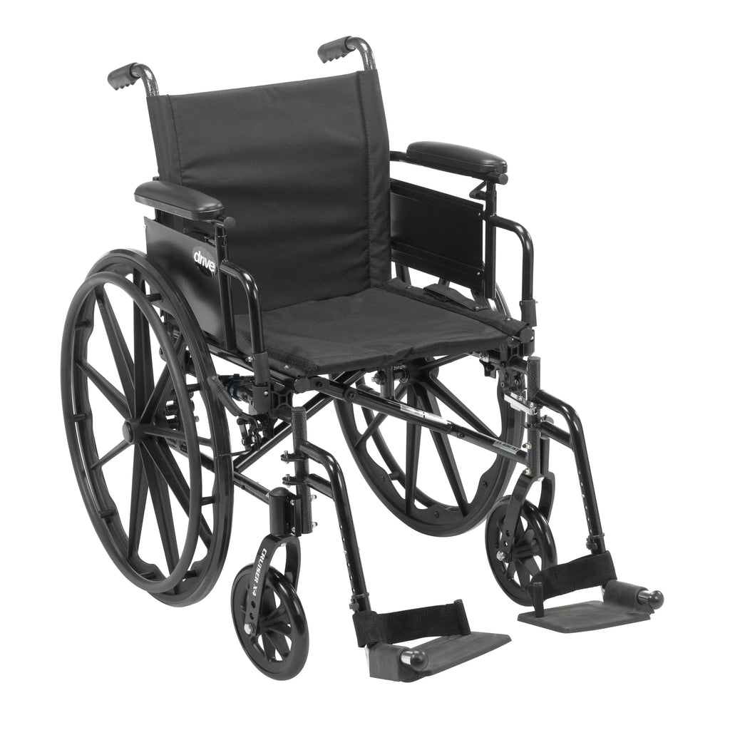 Don't let mobility challenges keep you from getting out and experiencing all life has to offer. For many people, a manual wheelchair is the ideal solution to maintaining mobility independence. Manual wheelchairs are among the most commonly used mobility devices thanks to their versatility, functionality, ease of transport and low maintenance. The Cruiser X4 from Drive Medical offers all these features and much more. The Cruiser X4 is ultra-lightweight, yet extremely strong thanks to its aluminum and carbon steel frame which is specially designed to allow for custom seat backs and accessories and includes our patented adjustable-depth seat. The rear wheels can be quickly and easily moved between three separate axles to adjust the seat to the ideal height for the user or to angle the seat back. Other comfort adjustments include armrest height, seat back height and the height and angle of the front caster wheels - all allowing you to tailor the Cruiser X4 to your specific needs. The Cruiser X4 also offers push-to-lock wheel locks to make locking the rear wheels easy - even for those with less hand strength. The Cruiser X4 is available with either swing-away footrests or elevating leg rests (ELRs), which are a necessity if you suffer from a condition such as edema, phlebitis, varicose veins or just tired legs. You can also choose 16", 18", and 20" seat widths for a chair that fits you to a "T". And all Cruiser X4 models include a lifetime warranty on the frame.