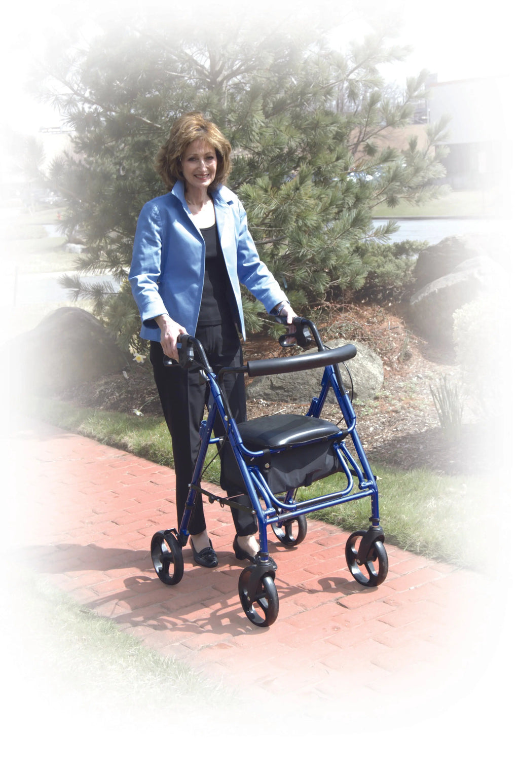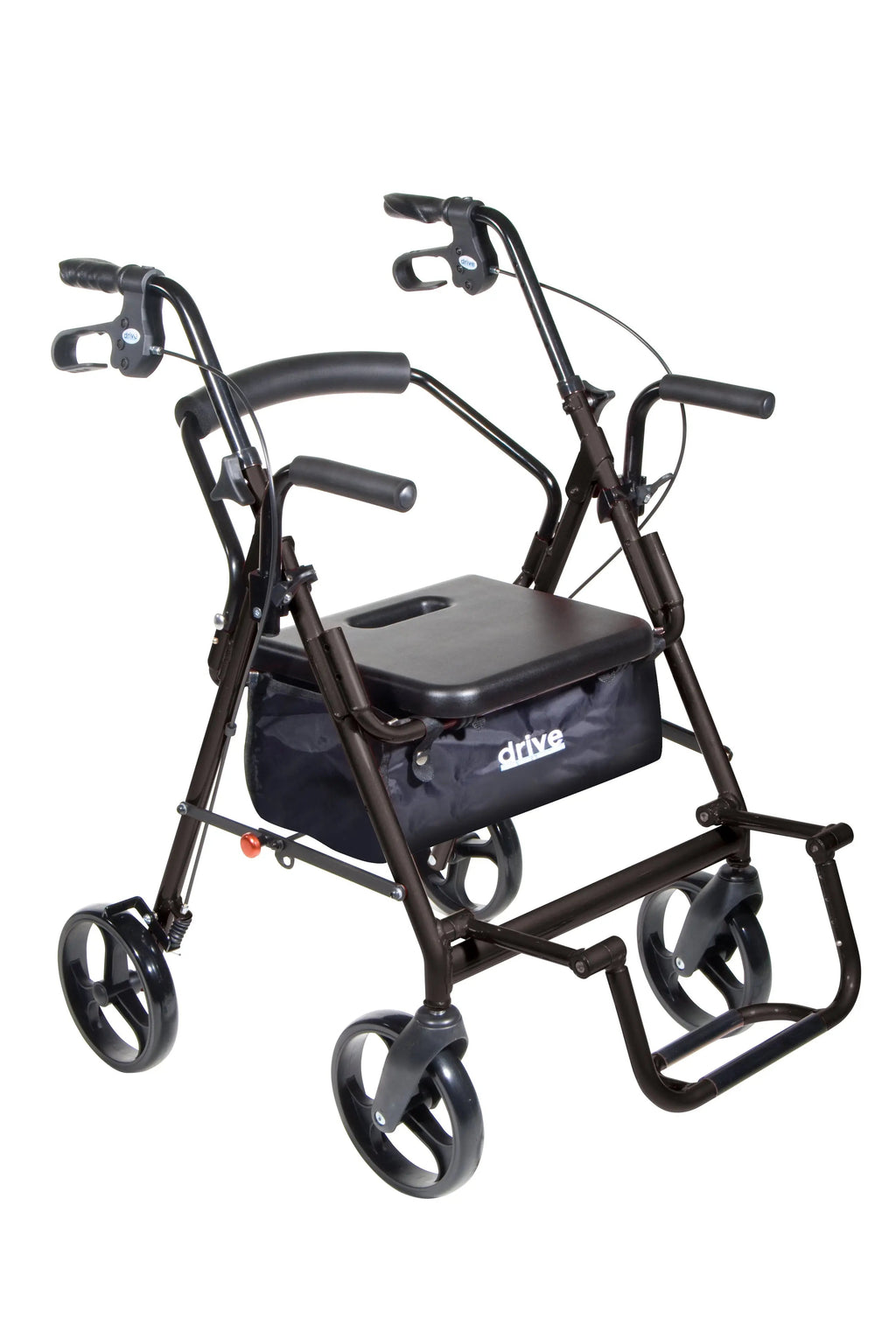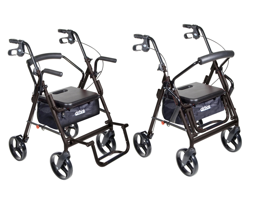 Experience the convenience and value of two outstanding products in a single safe, convenient aid to improving daily mobility with the Duet Rollator/Transport Chair from Drive Medical. As a Rollator, the Duet surpasses a standard walker by eliminating the need to lift the device and allowing you to walk with an easy, smooth gait. It handles uneven, outdoor terrain with ease and provides a comfortable and convenient place to rest with its cushioned seat. But the Duet is also a transport chair, making it great for being escorted around your home, or around the shopping mall. Simply lift the armrests, shift the backrest and lower the footrest into place, and your Duet is now a comfortable seat for you while a caregiver easily pushes you.