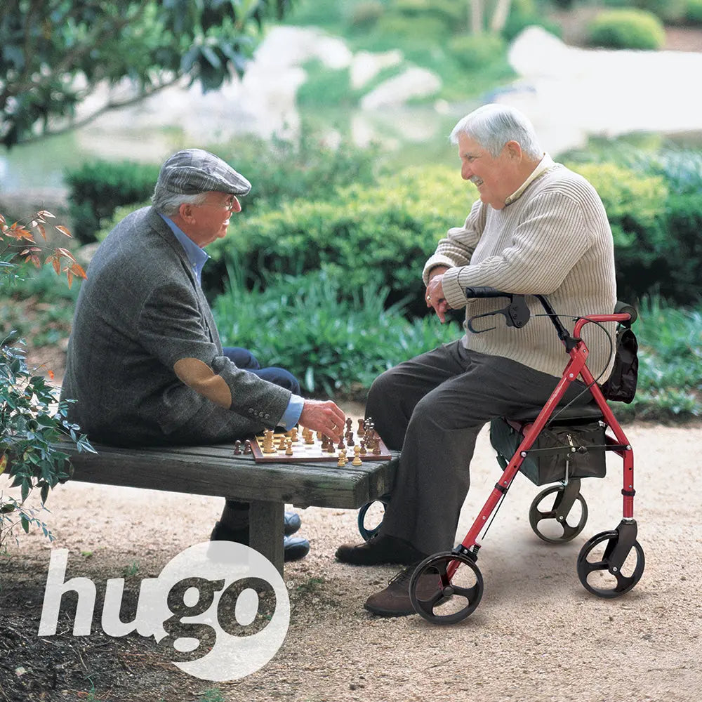 Rollator Walkers by Hugo give you the mobility, convenience and portability that you need in a walker. This Elite Rollator has a 2 inch height adjustable built-in seat with backrest that provides a perfect place to sit and rest. In addition, this mobility aid has a convenient under seat storage bag that provides security for your valuables. Hugo's Rollator Walker has height adjustable handle bars for proper posture and ergonomic hand grips which place your hands at a natural angle for comfort and better brake access. The tool-free assembly makes this mobility aid quick and easy to set up, simple to fold down for easy storage and even fits into most car trunks. Hugo‘s Elite Rolling Walker is designed to support adults up to 300 lbs and is well suited for those rehabilitating an injury, dealing with severe arthritis or those who have conditions that compromise their balance. With extra large 8 inch wheels, this rollator gives you reliable stability for more confidence and security when walking indoors or outdoors and includes a saddle bag for extra storage.