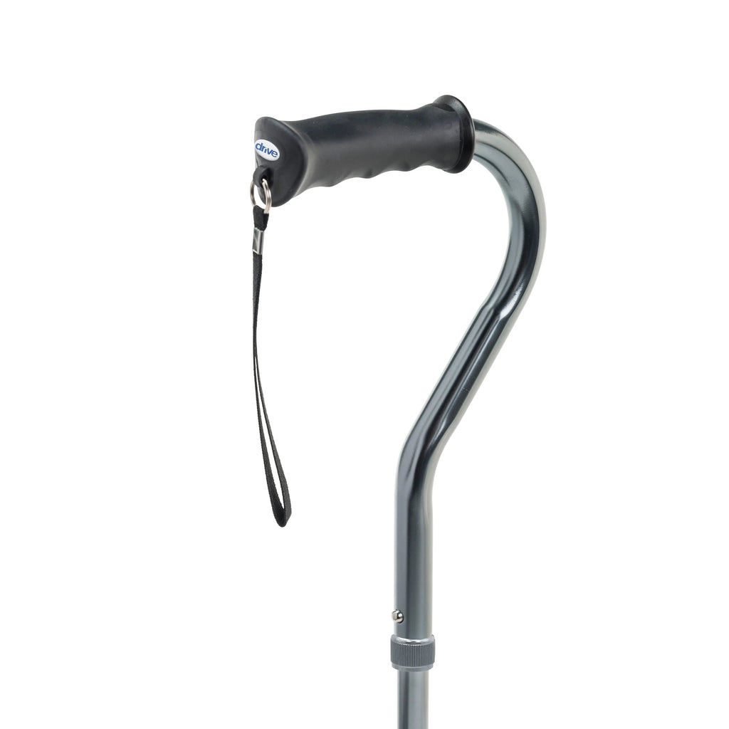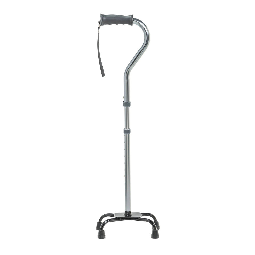 The Folding Quad Cane features a small footprint and folding design, making it ideal for display, storage and transport. Equipped with a four-point base and offset handle, the cane provides added stability and adjusts from 30-39" to accommodate varying user heights. The cane is made of extruded aluminum for added strength, while the contoured handle offers a comfortable grip.