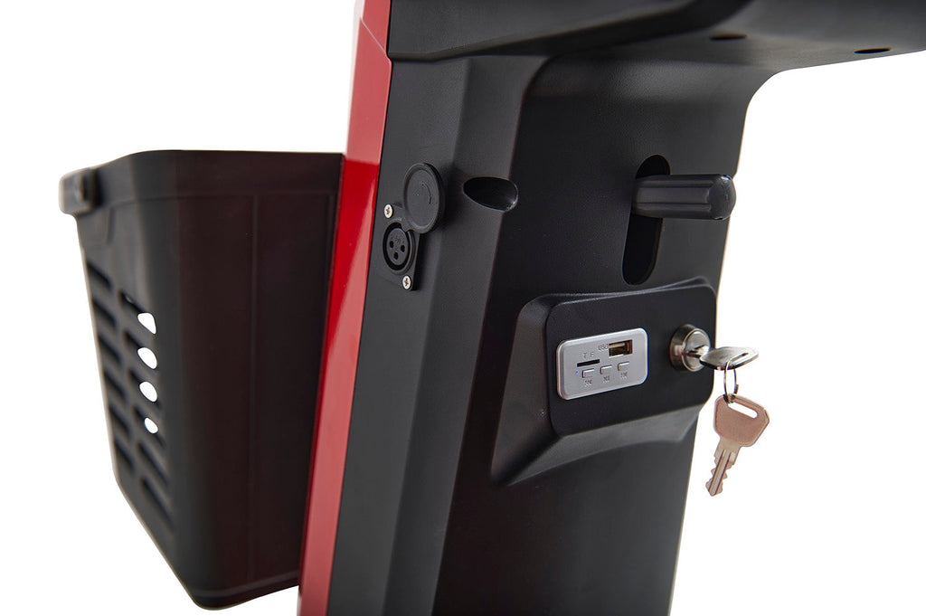 If you’re looking for the ultimate outdoor driving experience, look no further than the new Golden Eagle™. In a class all its own, the Eagle’s stylish yet rugged, off-road design is built for high performance and maneuverability with front and rear suspension for smoothly traversing outdoor terrain and a powerful 140 Amp controller for outstanding climbing ability. It offers a full LED lighting package, an adjustable tiller and a luxury high-back Captain’s seat for maximum comfort when on the go, plus durable vibrant red color shrouds for a sporty look. With a 500 lb. weight capacity, 13” pneumatic tires, up to 32-mile operating range on optional 75 AH batteries, plus a water resistant storage compartment that comes standard, the Golden Eagle offers everything you need to enjoy the great outdoors!