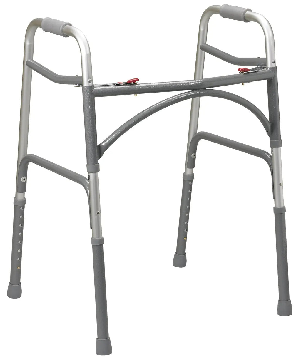 The Bariatric Aluminum Two Button Folding Walker by Drive Medical now comes in a wider and deeper frame designed to accommodate individuals up to 600 pounds. The precision design provides additional strength while adding minimal weight to the walker. The "U" brace, steel legs and side brace ensure security and stability.