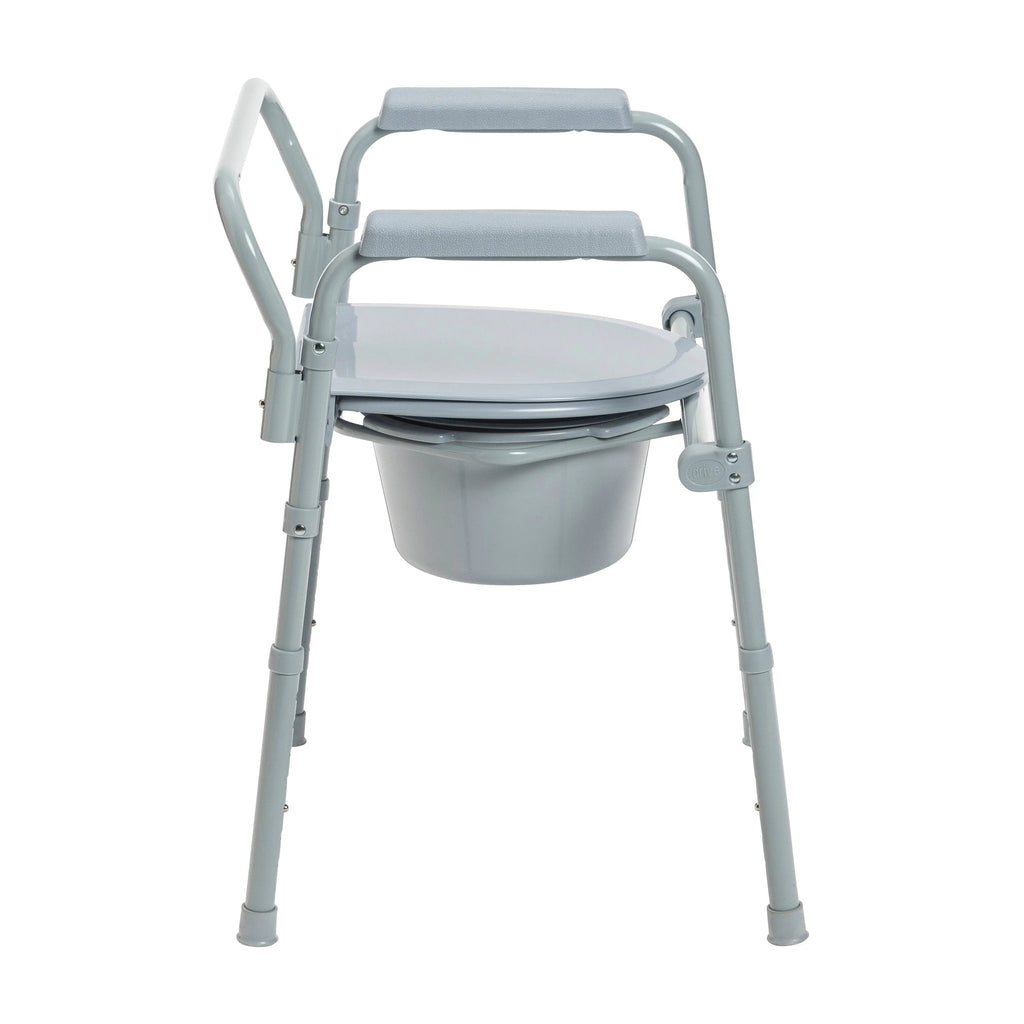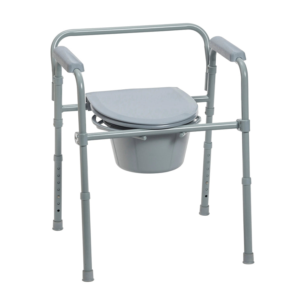Versatile PreserveTech 3-in-1 Folding Commode can be used as a bedside commode, raised toilet seat or a toilet safety frame. The adjustable folding commode is constructed with a lightweight and durable rust-resistant aluminum frame and includes several leg adjustments to accommodate different heights.