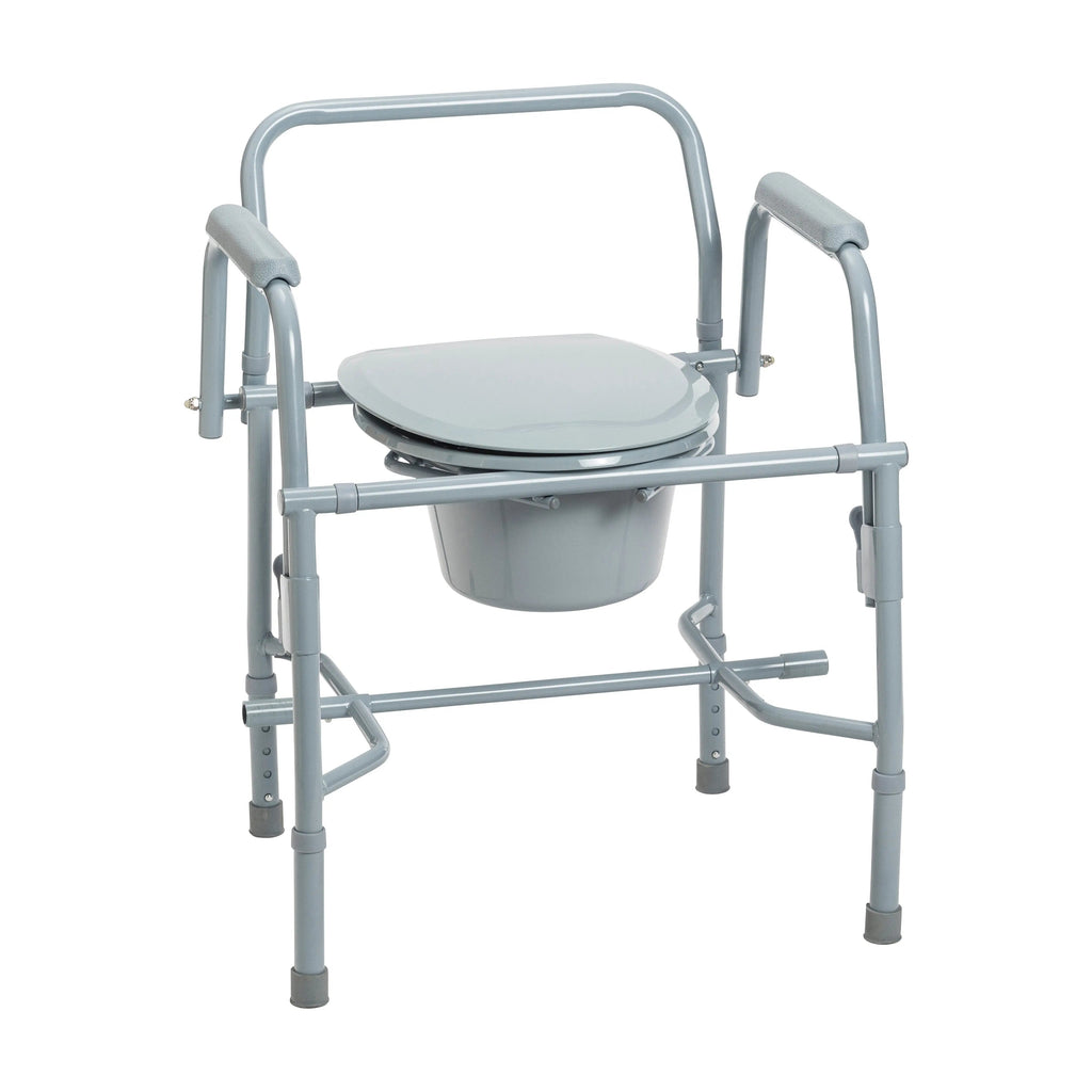 The deluxe steel drop arm bedside commode by Drive Medical is designed to meet your needs. The frame can be configured to be used as a bedside commode, toilet safety frame, elevated toilet seat or over your existing toilet. The tool free removable back makes configuring the commode easy for any application. The armrests provide a comfortable place to rest on when sitting and indicate a safe place to grab making sitting and standing easier. For consumers using a wheelchair the tool free drop arms makes lateral transfer to and from this commode easy and safe. The drop arms feature a large, easy to push release lever which is great for users with limited finger or hand dexterity. The push button height adjustable legs makes sizing a breeze allowing this commode to be used as an elevated toilet seat. In addition to comfort this commode can be disassembled with out tools making storage and travel convenient. The grey power coated steel welded construction ensures strength and durability able to hold up to 300 pounds. The product comes complete with a snap on seat and lid, 12-quart commode bucket with cover and convenient carry handle, plus splash guard.