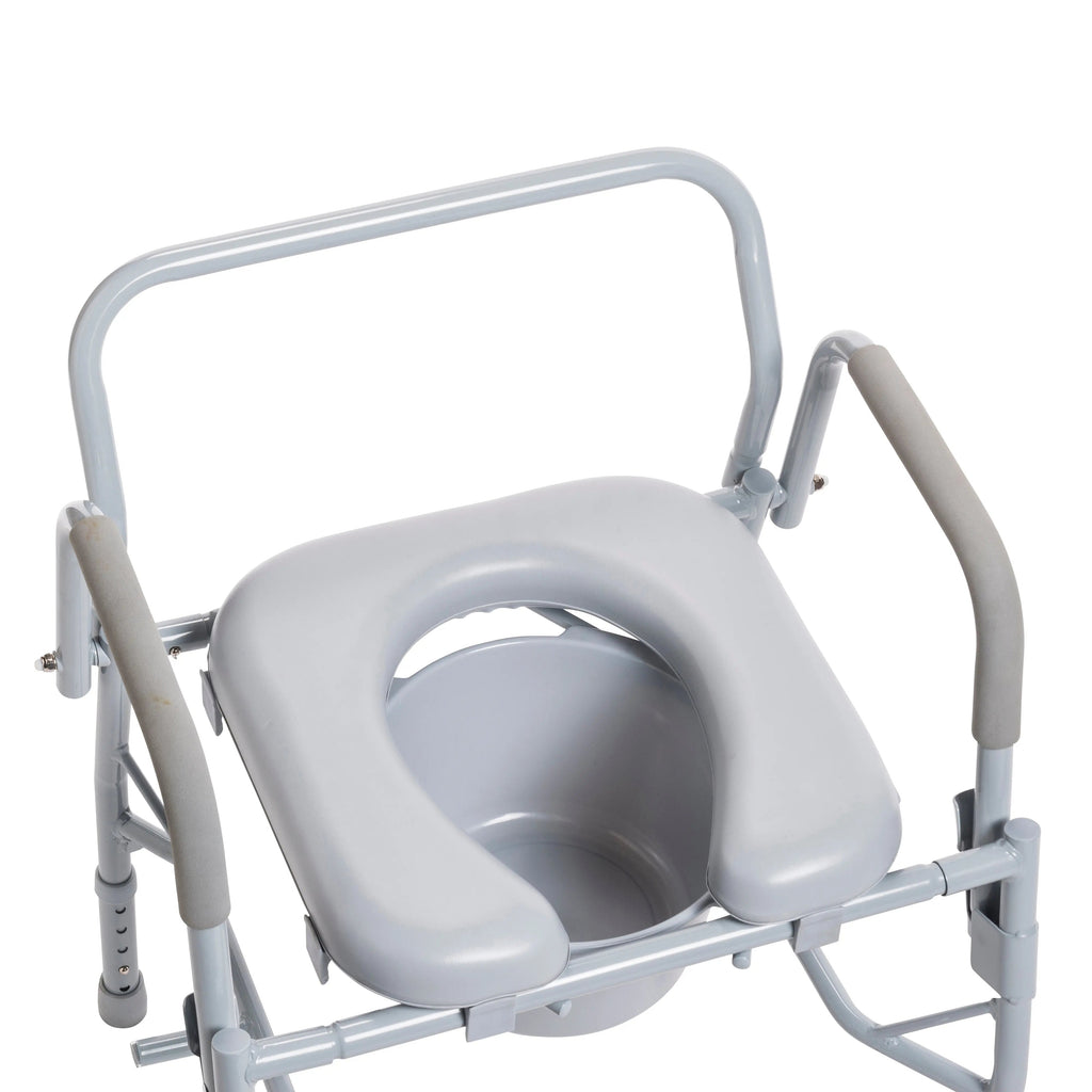 The deluxe steel drop arm bedside commode by Drive Medical is designed to meet your needs. The frame can be configured to be used as a bedside commode, toilet safety frame, elevated toilet seat or over your existing toilet. The tool free removable back makes configuring the commode easy for any application. The padded seat provides a comfortable place to rest on when sitting and the padded arm rests indicate a safe place to grab making sitting and standing easier. For consumers using a wheelchair the tool free drop arms makes lateral transfer to and from this commode easy and safe. The drop arms feature a large, easy to push release lever which is great for users with limited finger or hand dexterity. The push button height adjustable legs makes sizing a breeze allowing this commode to be used as an elevated toilet seat. In addition to comfort this commode can be disassembled with out tools making storage and travel convenient. The grey power coated steel welded construction ensures strength and durability. The product comes complete with a snap on seat and lid, 12-quart commode bucket with cover and convenient carry handle, plus splash guard.