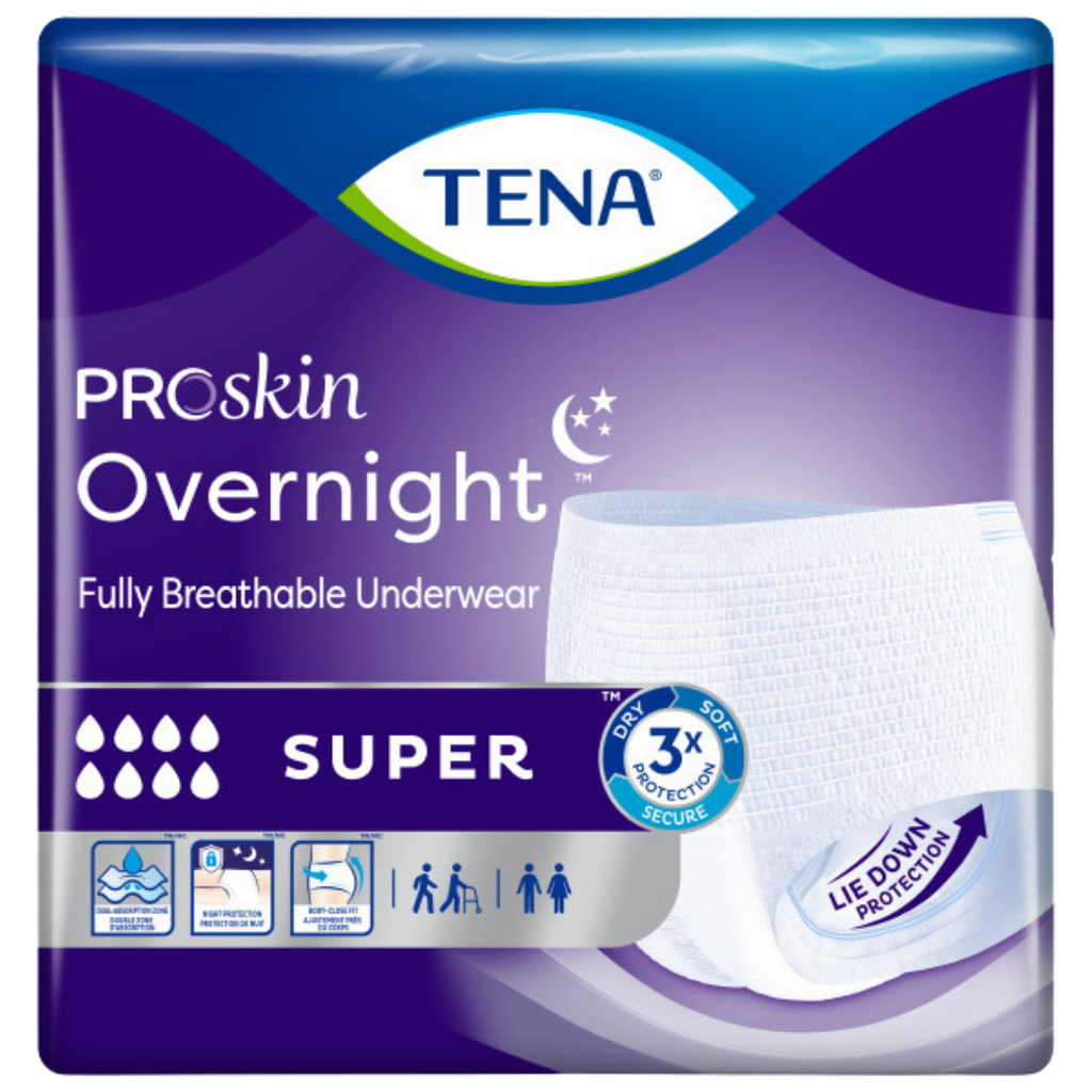 TENA ProSkin Overnight™ Super Fully Breathable Underwear are white, soft and comfortable night incontinence underwear with a pullup fit just like regular underwear. Designed with absorbency in the back where it’s needed most when lying down and an absorbant double core with leakage barriers, TENA ProSkin Overnight Super Fully Breathable Underwear offers leakage security throughout the night. This innovative incontinence underwear from TENA helps keep skin drier and protected for longer. With a body close fit for both men and women, this disposable night-time protective underwear stays in place even when moving and turning during the night. TENA ProSkin Overnight Super Fully Breathable Underwear quickly and efficiently draws moisture away from the skin, even with larger urine leaks, locking it deep inside the high-performance core for leakage security all night. Made of soft, breathable materials that helps promote skin health for medium to heavy night time incontinence. Enjoy a better night’s sleep with TENA ProSkin Overnight Super Fully Breathable Underwear.